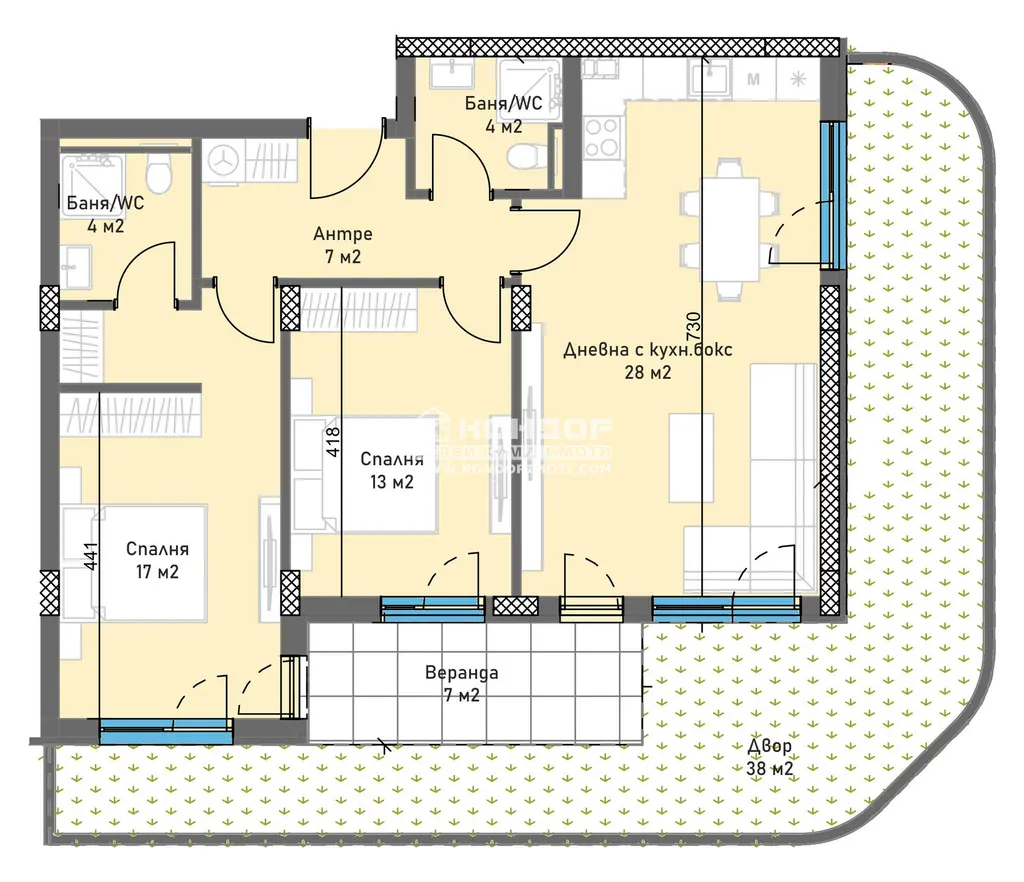 Оферта 64451: Предлагаме Ви възможността да закупите 3 - стаен апартамент с изложение ЮГ/ИЗТОК и двор към него в новоизграден луксозен жилищен комплекс с модерна визия, проектиран да създаде максимален комфорт на живущите в него. Функционално разположени жилищни секции с елегантен силует готов да предложи комфорт и модерен начин на живот. Едно от основните му предимства е страхотната локация, отлична комуникативност и динамична пътна инфраструктура, която осигурява бърз и лесен достъп до комплекса от всяка точка на града. Той съчетава лукс, спокойствие и комфорт с подсигурени паркоместа и гаражи. Жилището се състои от слънчева югоизточна дневна/28 кв.м./ със светла кухненска част и трапезария, две самостоятелни спални: детска 13кв.м. и родителска 17кв.м. със собствена баня, втора баня с тоалетна, входно антре с място за гардероб и перално, веранда и собствен озеленен двор 38кв.м. Към апартамента има избено помещение, включено в цената! Основната концепция при проектирането е да се постигнат просторни и функционални стаи, с цел да се създаде максимален уют на модерното семейство. Изключителна съвременна архитектура и модерна технология на строителство. Визията е иновативна, привличаща внимание с уникалността си.Всяко жилище разполага с пълно окабеляване за домофон, интернет и кабелна телевизия, общите части са луксозно завършени, жилищата са с алуминиева дограма с троен стъклопакет от най-висок клас, масивна блиндирана входна врата. За удобство на живущите съществува възможността да закупят подземни паркоместа и гаражи с топла връзка към комплекса. Гъвкави схеми на разсрочено плащане спрямо възможностите на клиента в рамките на строителството или закупуване чрез Банков Кредит, на изключително изгодни условия за клиенти на агенцията !!!