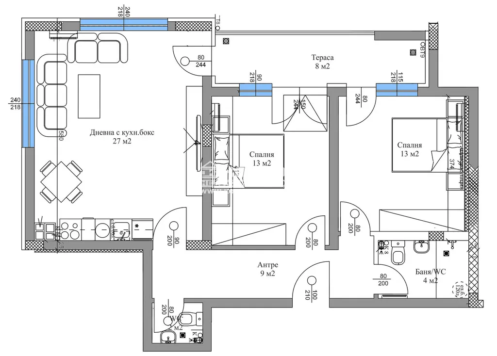 АПАРТАМЕНТИ с просторни стаи с правилни форми и много светлина!!! Жилището което Ви презентираме е със следното функционално разпределение: светла дневна с трапезария и кухненски бокс с две изложения; две спални; тераса с излаз от трите стаи; баня с тоалетна; тора тоалетна и антре.