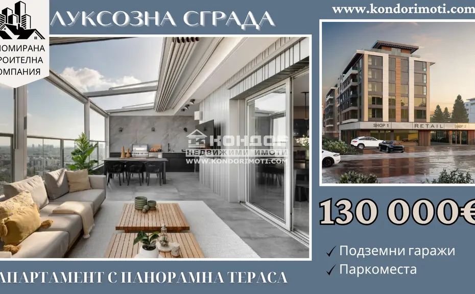 Оферта 63589: Имаме Удоволствието да ви Предложим просторен и функционален Тристаен Апартамент С ГОЛЯМА ПАНОРАМНА ТЕРАСА С МЯСТО ЗА БАРБЕКЮ И КЪТ ЗА ОТДИХ в луксозна сграда, отличаваща се с модерна и съвременна архитектура в един отлично развиващ се район за живеене райони с отлична локация в близост до Училища, детски градини, удобен транспорт към централна градска част и големи хипермаркети. Проектът е с нисък процент общи части, което дава възможност на клиентите да получат повече реална площ !!! Жилището се състои от дневна с трапезария и кухненски бокс /23 кв.м./, две непреходни спални, баня с тоалетна, входно антре и две прекрасни тераси. Сградата е изпълнена от реномирана строителна компания, която разполага с множество готови обекти, утвърдила се като една от водещите и коректни фирми в града. Апартаментите ще са завършени според всички изисквания за съвременно строителство - блиндирана врата, 6-камерна дограма, МДФ-вътрешни врати. Луксозни общи части, хидро и топло изолация, хидравличен асансьор, гранитено стълбище, алуминиев парапет. Свободни Подземни Гаражи и външни Паркоместа. Сградата се намира на приятно и спокойно място в близост до училища, детска градина и удобен транспорт - ОТЛИЧНА ИНВЕСТИЦИЯ !!! Възможност за изплащане на разсрочено плащане в рамките на строителството !!!