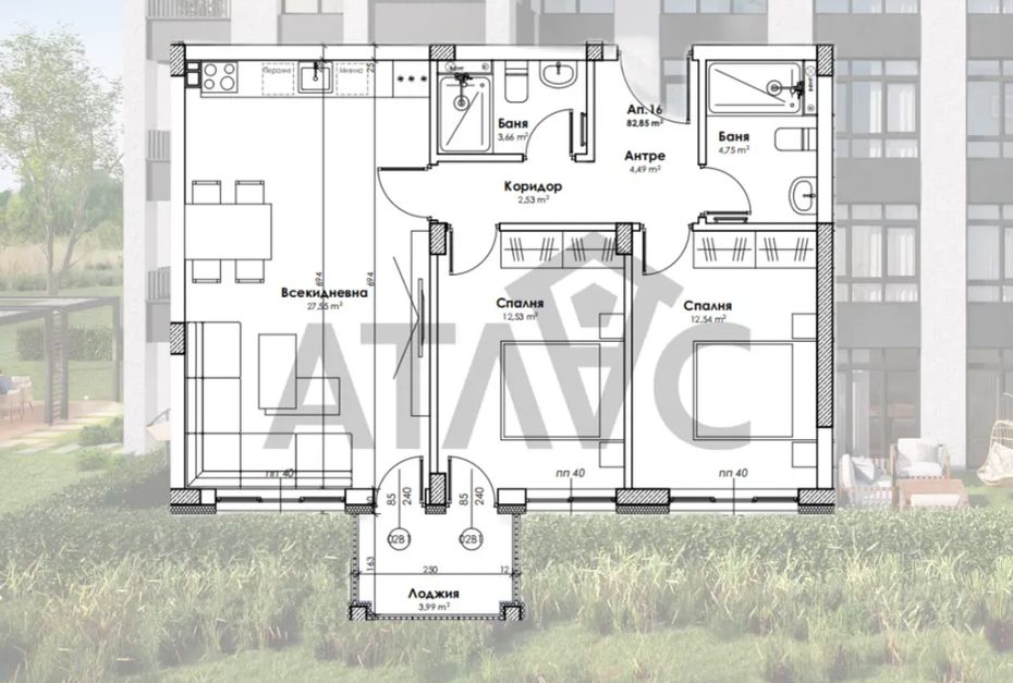 Сградата предлага бутикови апартаменти с панорамни тераси или големи озеленени собствени дворове, надземни гаражи и паркоместа.