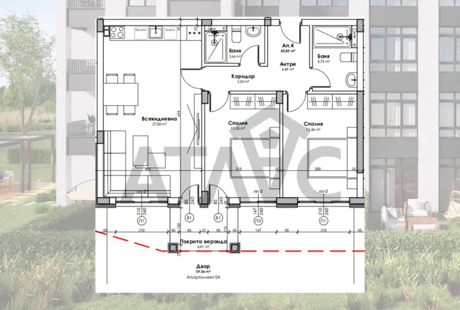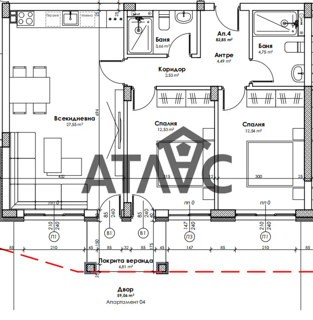 Представяме ви двустаен апартамент в малка бутикова сграда в кв. Прослав в начален етап. Разпределението на жилището е следното: хол с кухня и трапезария, две спални, две бани с тоалетна, входно антре, покрита веранда и озеленен двор за лично ползване с площ 59 кв.м.