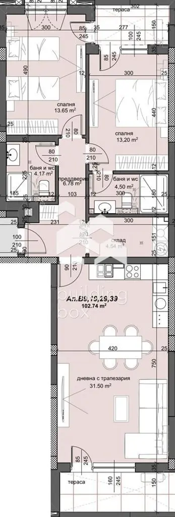 - РАЗПРЕДЕЛЕНИЕ: Състои се от голяма правоъгълна всекидневна с кухненски бокс, с площ от 31,50 кв.м, две спални с площ от 13 кв.м и 14 кв.м, два санитарни възела над 4 кв.м, складово помещение с площ от 4,50 кв.м, антре и две тераси.