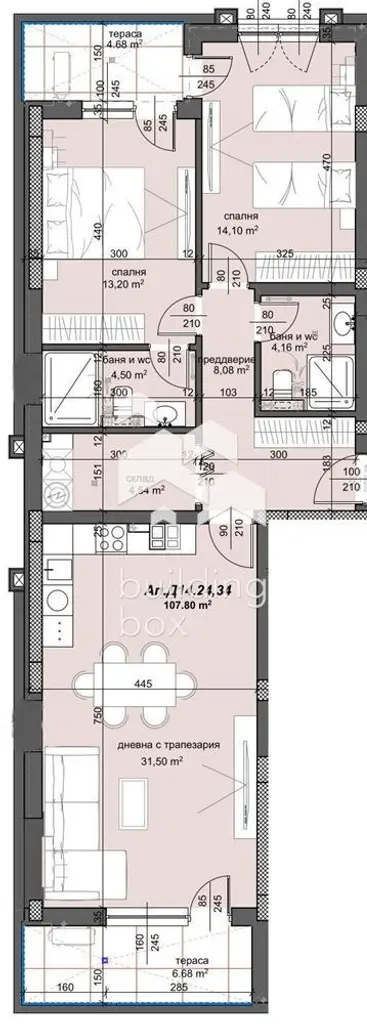 - РАЗПРЕДЕЛЕНИЕ: Състои се от голяма правоъгълна всекидневна с кухненски бокс, с площ от 31,50 кв.м, две спални с площ от 13 кв.м и 14 кв.м, два санитарни възела над 4 кв.м, складово помещение с площ от 4,50 кв.м, антре и две тераси.