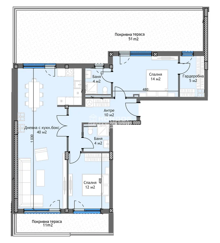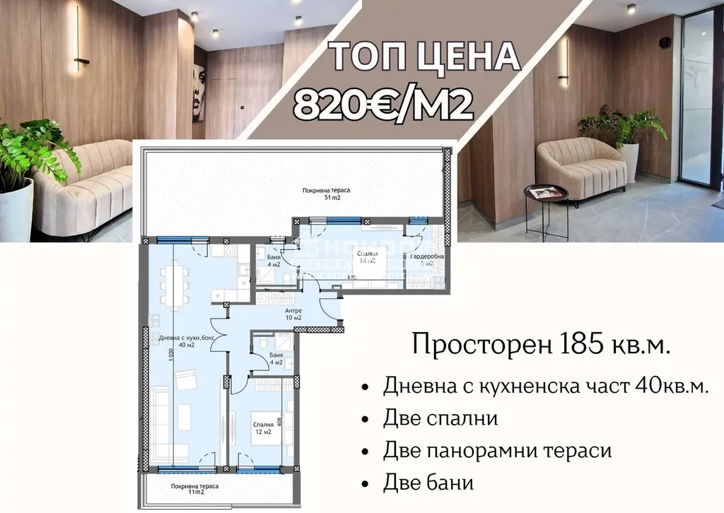 Оферта 64837: Предлагаме Ви възможността да закупите тристаен апартамент в новоизграден луксозен жилищен комплекс с модерна визия, проектиран да създаде максимален комфорт на живущите в него. Функционално разположени жилищни секции с елегантен силует готов да предложи комфорт и модерен начин на живот. Едно от основните му предимства е страхотната локация, отлична комуникативност и динамична пътна инфраструктура, която осигурява бърз и лесен достъп до комплекса от всяка точка на града. Той съчетава лукс, спокойствие и комфорт с подсигурени паркоместа и гаражи. Жилището се състои от светла дневна/40 кв.м./ с кухненска част и трапезария, две самостоятелни спални: родителска 14кв.м. със собствена баня и голям дрешник, детска 12кв.м., втора баня с тоалетна, входно антре с място за гардероб, килер и две панорамни тераси тип лятна/зимна градина с място за изграждане на барбекю. Основната концепция при проектирането е да се постигнат просторни и функционални стаи, с цел да се създаде максимален уют на модерното семейство. Изключителна съвременна архитектура и модерна технология на строителство. Визията е иновативна, привличаща внимание с уникалността си. Всяко жилище разполага с пълно окабеляване за домофон, интернет и кабелна телевизия, общите части са луксозно завършени, жилищата са с алуминиева дограма с троен стъклопакет от най-висок клас, масивна блиндирана входна врата. За удобство на живущите съществува възможността да закупят подземни паркоместа и гаражи с топла връзка към комплекса. Гъвкави схеми на разсрочено плащане спрямо възможностите на клиента в рамките на строителството или закупуване чрез Банков Кредит, на изключително изгодни условия за клиенти на агенцията !!!ВИЖТЕ ОЩЕ ИЗГОДНИ ОФЕРТИ НА https://www.kondorimoti.com/ С ЕЖЕДНЕВНА АКТУАЛИЗАЦИЯ!