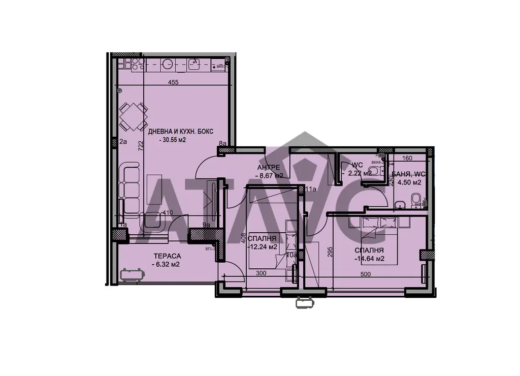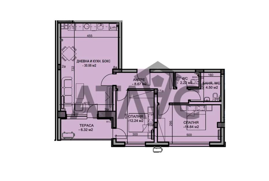 ❌ На схемата се вижда един от тристайните апартаменти, състоящ се от просторен хол с кухненски бокс, две спални, баня с тоалетна, отделно тоалетна, входно антре, тераса и прилежащо избено помещение!