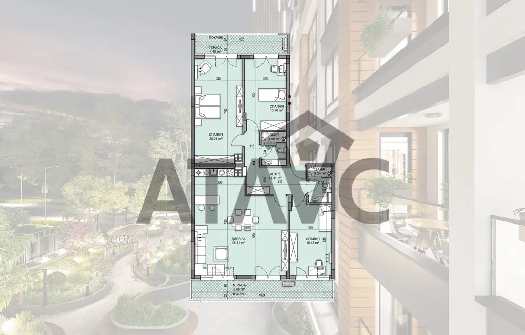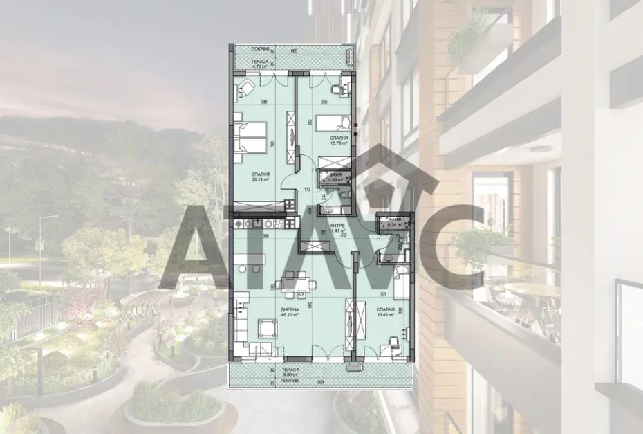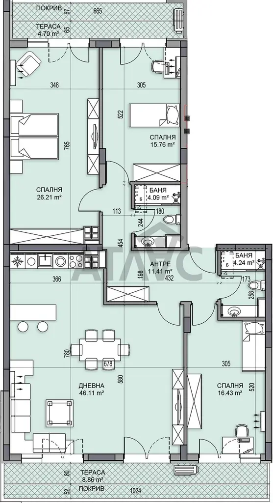 Жилището предлага просторна дневна с кухня, трапезария и излаз към тераса, три самостоятелни спални, две бани и входно антре. Разпределението е функционално и удобно, с ясно обособени дневна и нощна зона, което го прави подходящо за голямо семейство.