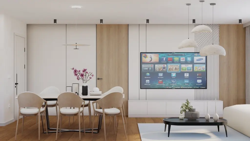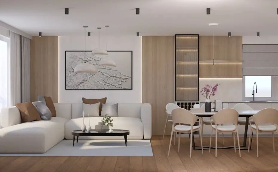 Разпределението включва просторна дневна с кухненски бокс и излаз на тераса, три спални, две от които с обща тераса, две бани с тоалетна и входно антре. Това осигурява удобство и функционалност за семейство или инвестиция.