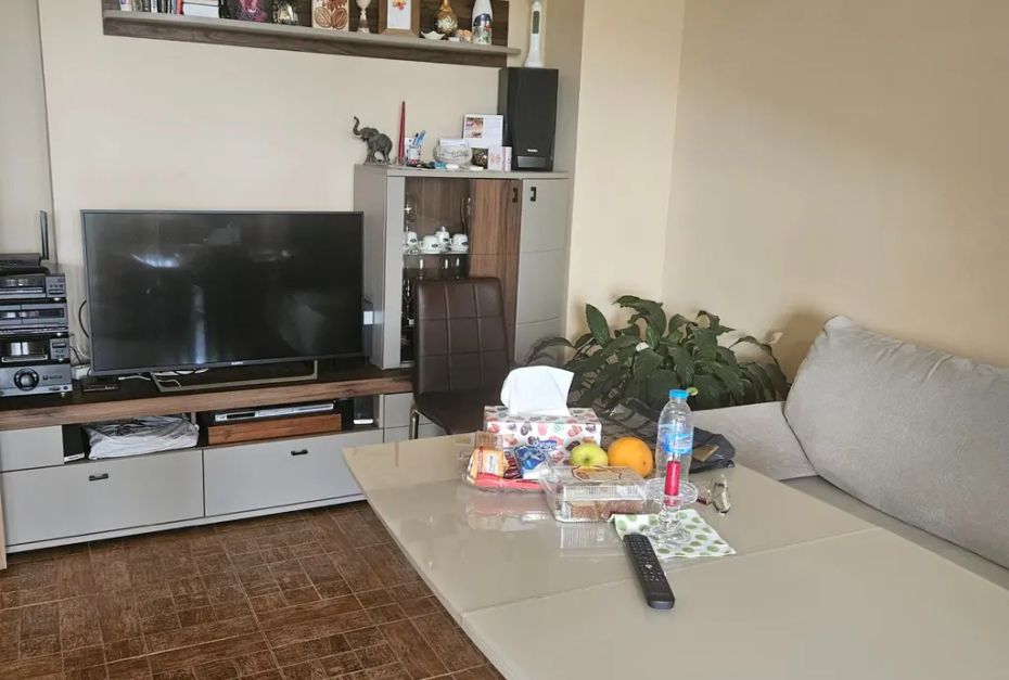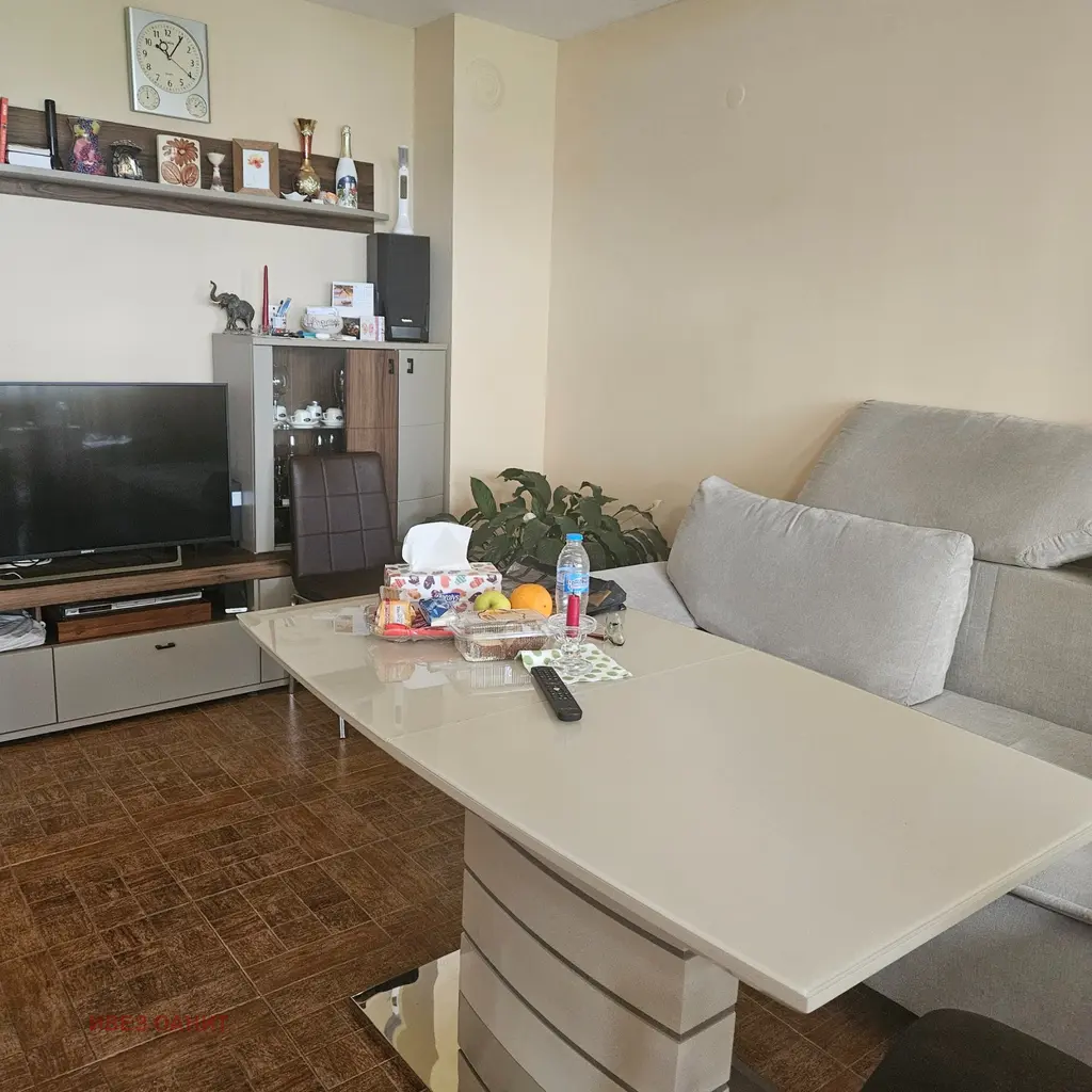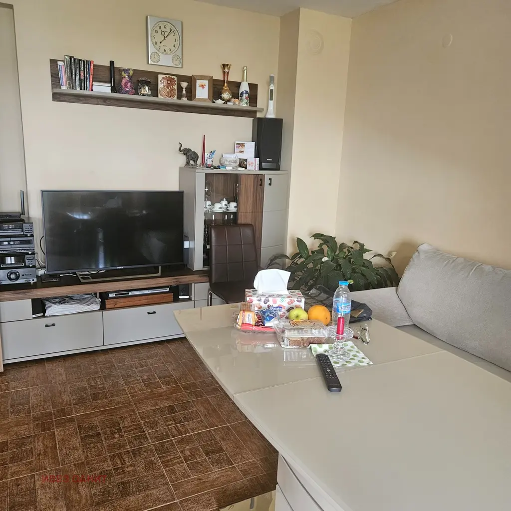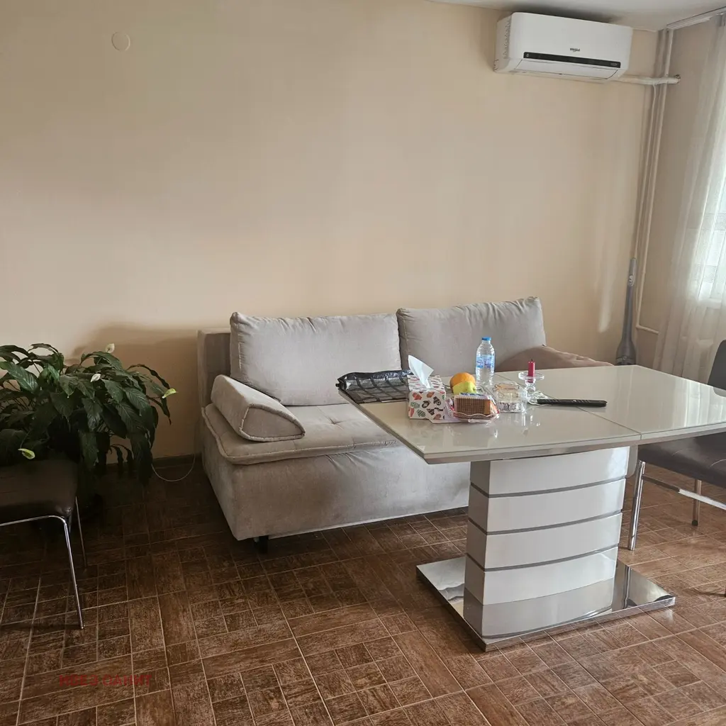 Сградата е разположена на тиха, вътрешна улица в квартала, в близост до църквата и пощата. Жилището е просторно, светло с отлична гледка, изложение север/юг. Разпределението е: голямо входно антре, самостоятелни дневна с огромна покрита тераса и светъл кухненски бокс, самостоятелна спалня с тераса, ориентирана на юг, просторна баня и тоалетна. Към имота има мазе с площ около 6кв.м. Напълно завършен и обзаведен с нови мебели и електроуреди, както се вижда по снимките. Огледи по договорка, разполагаме с ключ, 0888699922