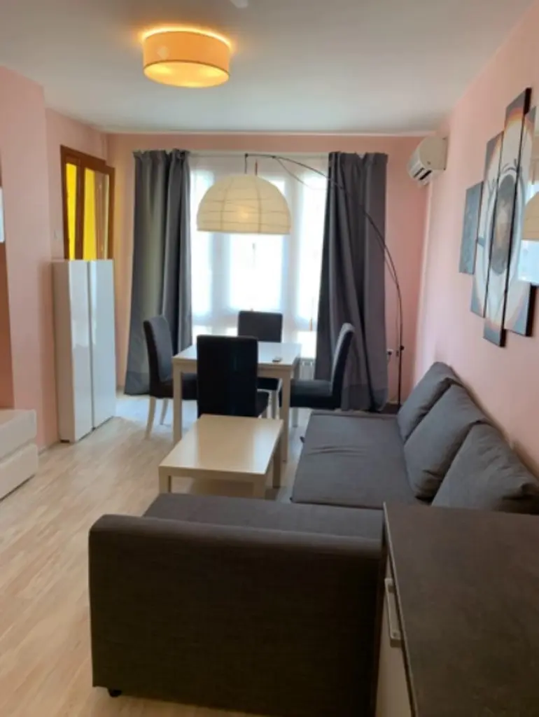 Имотът е обзаведен, с площ 65 кв.м, на 4-ти от 8 етажа в сграда с асансьор. Разпределението включва входно антре, хол с кухня и трапезария, спалня, баня с тоалетна и тераса.