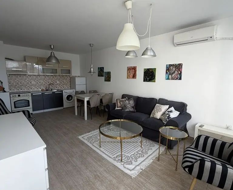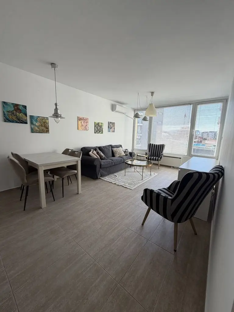Имотът е обзаведен, с площ 70 кв.м, на 2-ри от 6 етажа в сграда с асансьор. Разпределението включва входно антре, хол с кухня и трапезария, спалня, баня с тоалетна и тераса.