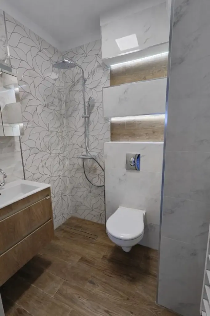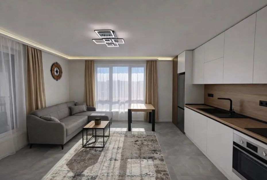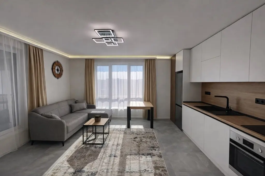 Имотът е обзаведен, с площ 65 кв.м, на 6-ти от 13 етажа в сграда с асансьор. Разпределението включва входно антре, хол с кухня и трапезария, спалня, баня с тоалетна и тераса.