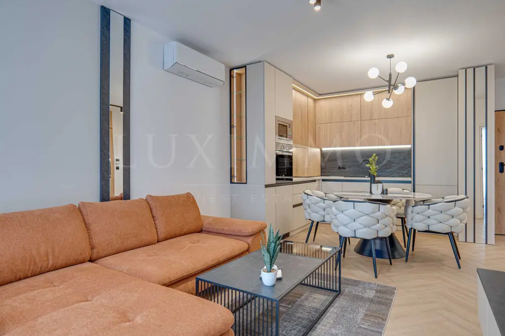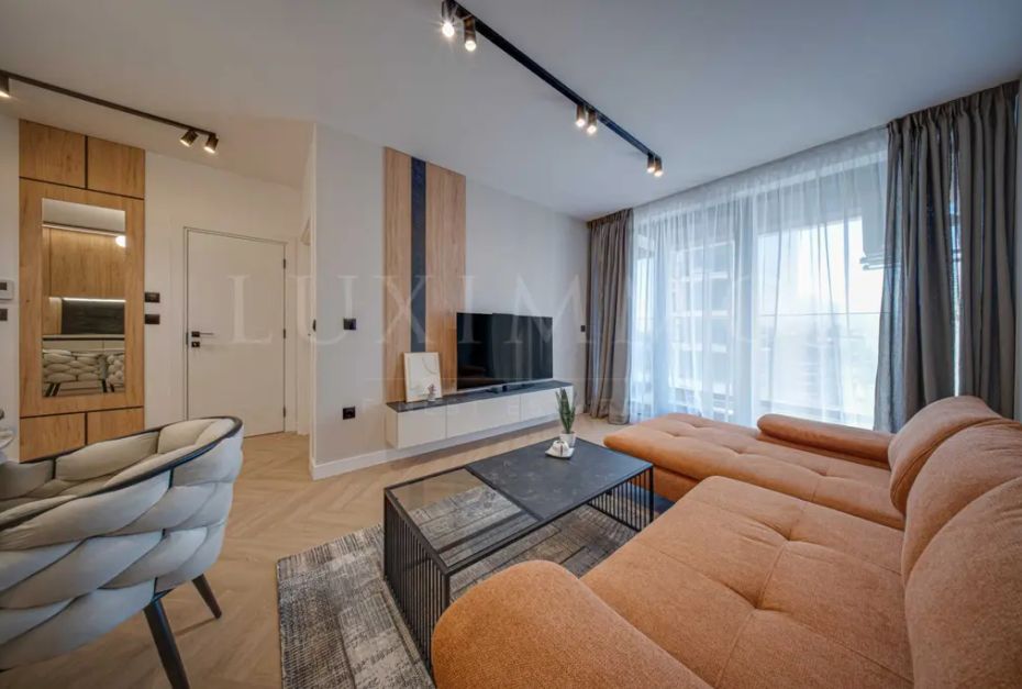 Представяме модерен двустаен апартамент по дизайнерски проект в сграда OKINAWA Boutique Residence. Възможно е закупуването на подземно паркомясто с контакт за зареждане на ел. автомобил на допълнителна цена от 27 000 евро без ДДС. В цената е включено мазе с площ 3.40м2. Сградата е с Разрешение за ползване (Акт 16) от 2025г. и разполага с луксозни общи части от мрамор, два асансьора Schindler, контрол на достъп, външен street фитнес и озеленен двор. Отоплението е подово на газ с котел Viessman, а охлаждането е решено чрез климатична сплит-система Gree. Сградата е с енергиен сертификат клас А и е изпълнена с окачена фасада Laminam, френски прозорци, алуминиева дограма с троен стъклопакет и топли дистанционери, с топло- и шумоизолация от каменна вата на външни стени и между жилищата тип сандвич (тухла-вата-тухла), варова дишаща мазилка в апартаментите и италиански блиндирани входни врати Dierre. РЗП на имота: 76.54 кв.м. Жилището е разположено на 5-и жилищен етаж от 8 за сградата. Върху застроена площ от 57.85м2 са разпределени: дневна с кухня и трапезария, спалня, обща за двете стаи тераса, баня и мокро помещение. Настилка - водоустойчива винилова SPC клас 34; стени - варова шпакловка и дишащ латекс; баня испански гранитогрес от Roca и Porcelanite Dos, 1-во качество; структури за вграждане Roca, шкафове Roca и по поръчка от МДФ; кухня по поръчка и облицовки стени от МДФ - Egger с обкови Blum; всички вградени електроуреди