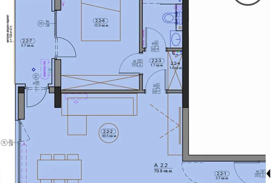 Разпределението включва входно антре, голяма дневна с кухненски бокс над 30 кв.м., тераса с двоен излаз, спалня, баня с тоалетна и склад.