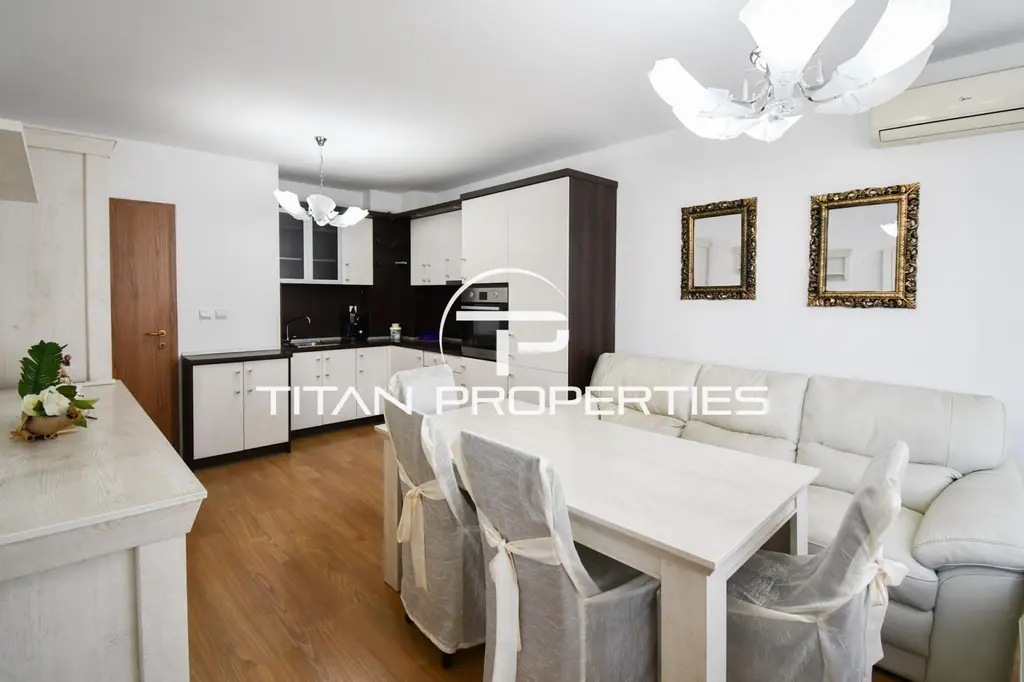 Просторният хол с трапезария и кухненски бокс е свързан с тераса. Предвидена е отделна самостоятелна спалня, баня с тоалетна, помощно помещение (килер) и още една тераса. Апартаментът е обзаведен, оборудван с газово отопление, климатик и интернет окабеляване, а охраната гарантира спокойствието ви. Месечният наем е 670 EUR.