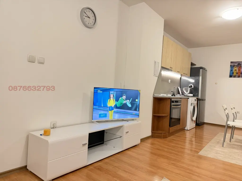 Състои от входно антре, дневна с трапезария, напълно оборудван кухненски бокс, тераса към дневната с прекрасна панорамна гледка към Витоша, спалня и баня с тоалетна. Обзавеждането включва кухненски шкафове, хладилник, пералня със сушилня,телевизор и ТВ шкаф, вградени фурна и котлони, разтегателен диван и 2 помощни масички в дневната, маса за хранене и 4 стола в трапезарията,кафе машина, двойно легло, гардероб и скрин в спалнята. Отоплението и топлата вода са на газ с индивидуално котле. В дневната е монтиран и климатик.