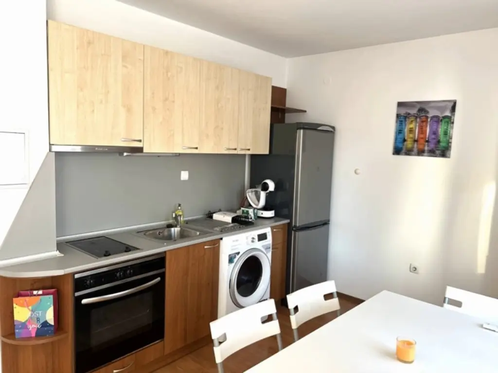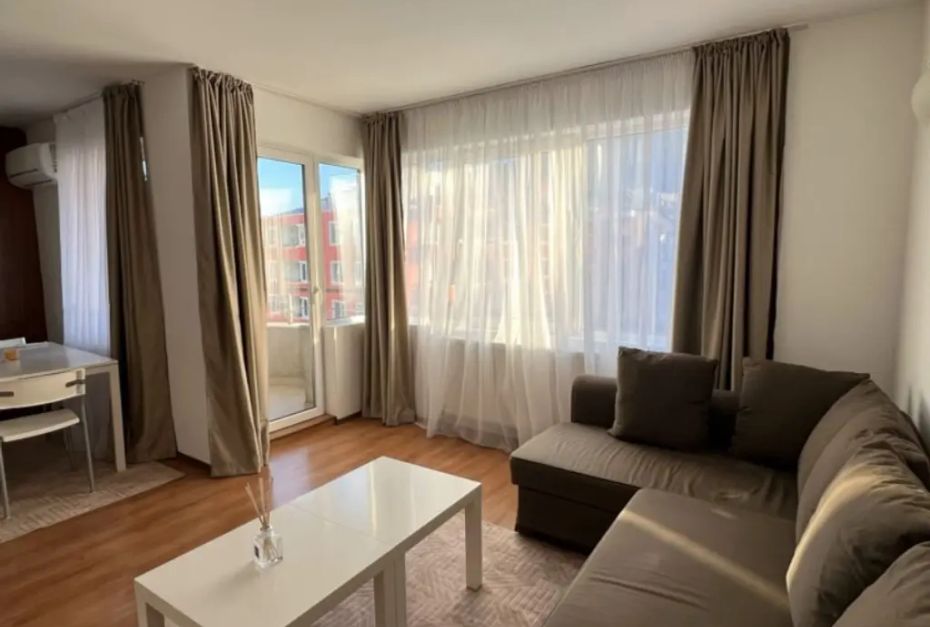 Имотът е обзаведен, с площ 60 кв.м, на 4-ти от 6 етажа в сграда с асансьор. Разпределението включва входно антре, хол с кухня и трапезария, спалня, баня с тоалетна и тераса.