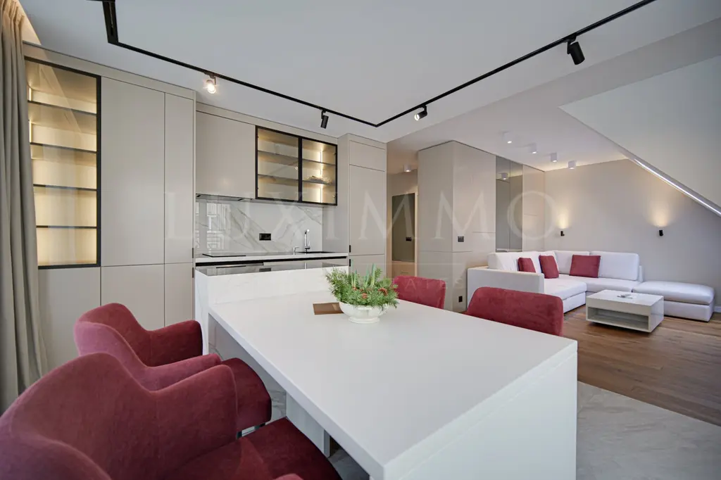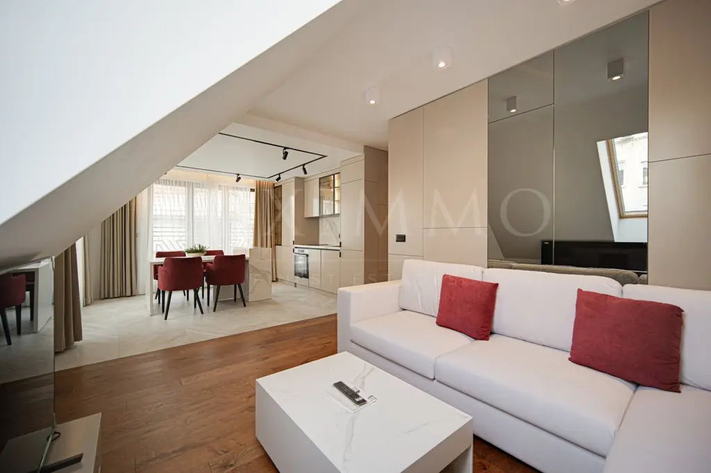 Сградата е изпълнена с висок клас материали, красива фасада от естествен камък и с представителни общи части. Налични са апартаменти тип студио, двустаен, тристаен и premium тристаен мезонет. Всички жилища са чисто нови и луксозно обзаведени.