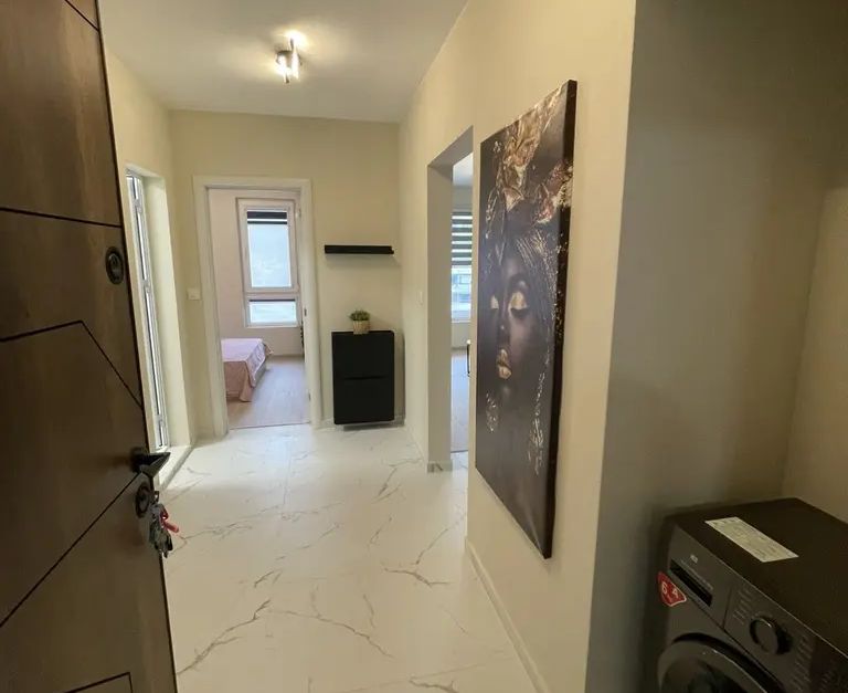 Разпределение: антре, хол с кухненски кът - маса със столове, разтегателен диван с ракла, холна секция. Кухнята е поръчкова с вградена фурна и котлони, пералня.