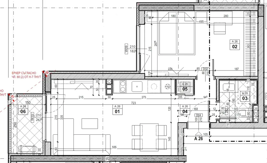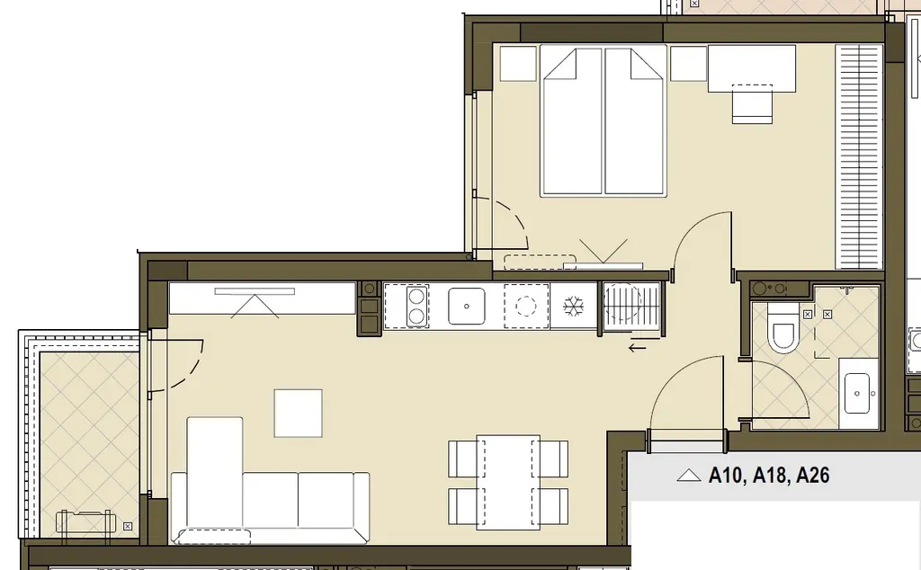 АПАРТАМЕНТ А26 - ЗП - 51,53 кв.м.; ОЗП - 60,47 кв.м.; Изложение: ЗАПАД