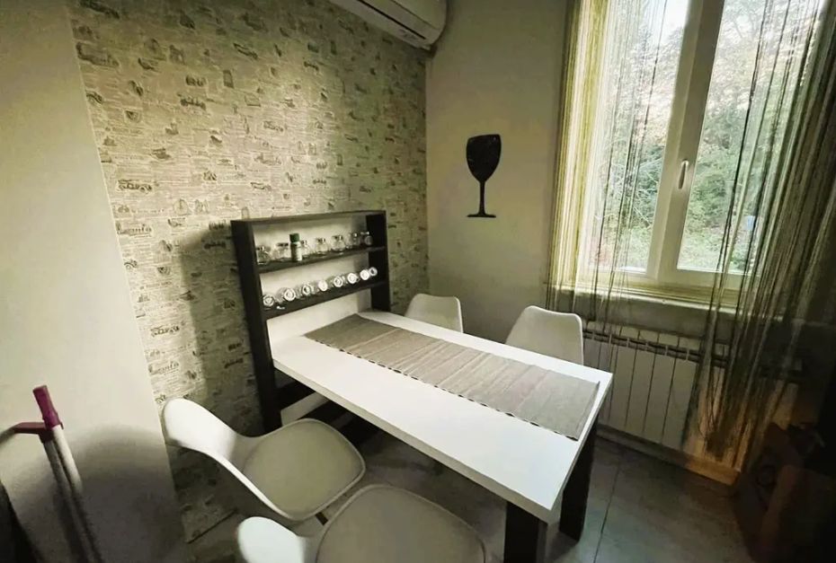 Имотът е обзаведен, с площ 90 кв.м, на 1-ви от 2 етажа в къща. Разпределението включва включва входно антре, хол, кухня с трапезария, 2 спални, баня с тоалетна и самостоятелен двор.