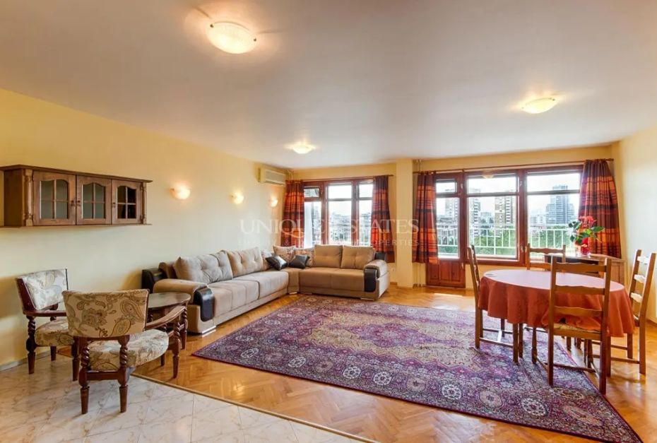 Дневната е с югоизточно изложение и гледа към Витоша. Панорамата от балкона към хола е прекрасна. Спалните са тихи, слънчеви и също с гледка към oзеленen вътрешен двор и планината. Изложението на спалните е югозапад. Има и балкон към тях. Жилището е с хубава, просторна баня, самостоятелна тоалетна за гости и мокро помещение.