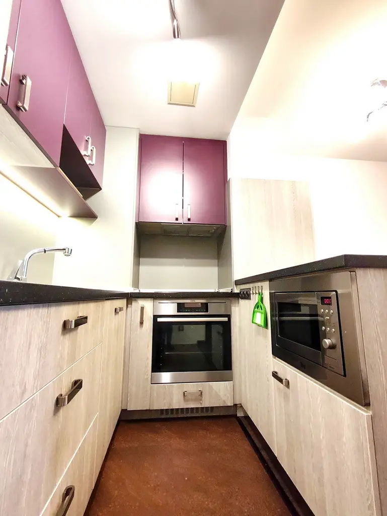 🛋️ Оборудван е с пълен набор висок клас техника- фурна, котлони, абсорбатор, хладилник с фризер, съдомиялна машина, микровълнова печка, кухненска мелница за отпадъци, пералня, сушилня. Дневната е обзаведена с кухня по поръчка, маса за хранене със столове, диван и табуретка с тапицерия от естествена кожа и тв шкаф. По-голямата спалня е обзаведена с двойно легло с матрак Магнифлекс, нощни шкафчета, гардероб, шкаф и помощни мебели. По-малката спалня е обзаведена с гардероб и шкафове, може да се закупи легло или друго обзавеждане спрямо нуждите на наемателя.