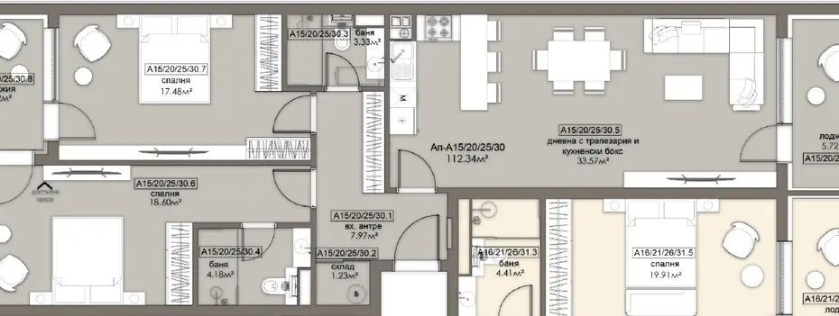 Просторен светъл и уютен 336стаен апартамент, отговарящ на всички изисквания за един съвременен дом. Апартамент А30 на схемата. Удобно и функционално разпределение, големи, комфортни и светли помещения. Чиста площ 112,34кв.м., площ с общи части 128,84кв.м. Възможност за пълноценно и безкомпромисно обзавеждане на всички помещения.