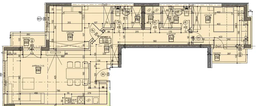 Апартамент Б-13 е ситуиран на 3-ти жилищен етаж и разполага със застроена площ от 101,54 кв.м., разгърната по следния практичен начин: антре, дневна с трапезария и кухненски бокс, 2 спални, 2 бани с тоалетни, мокро помещение, 2 тераси.