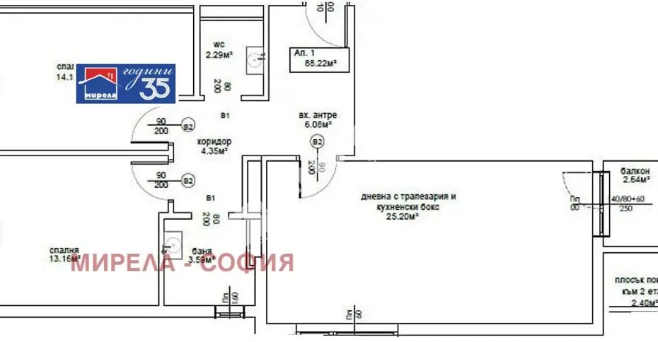 Апартаментът, който Ви представяме, има следното разпределение: антре, дневна с куненски бокс, две спални, баня с тоалетна, отделна тоалетна и балкон.