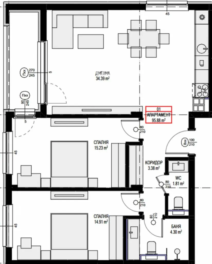 Просторен тристаен апартамент, със западно изложение състоящ се от: