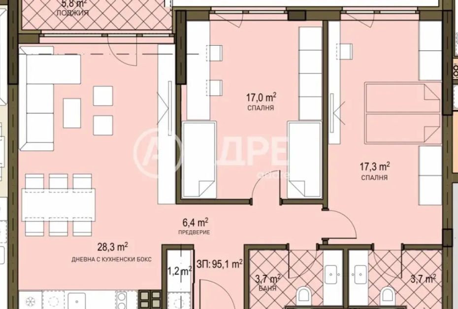 кухненски бокс и трапезария, две спални, две бани с тоалетна, мокро