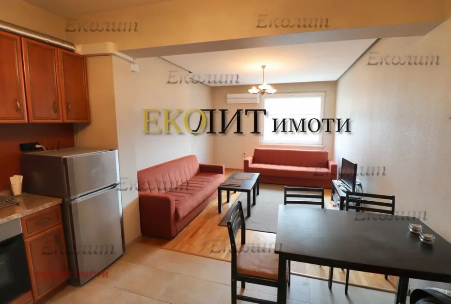 Дневна, трапезария и кухненска част с мека мебел, холна маса, TV сет с LED телевизор, трапезна маса, столове, корпусни шкафове с бяла техника и КЛИМАТИК.