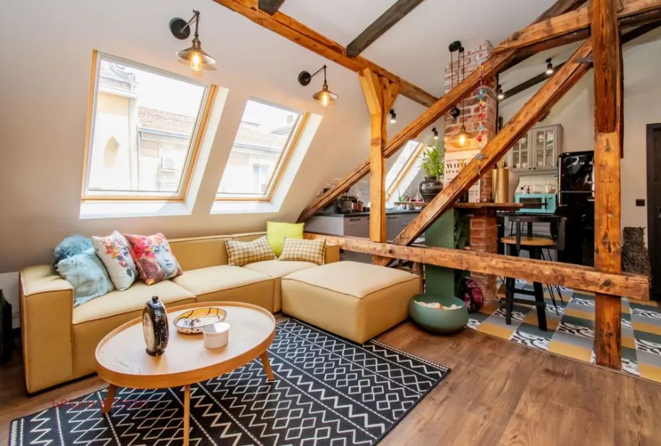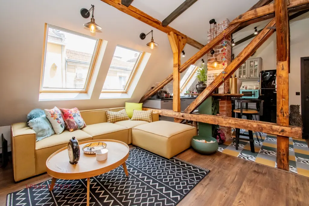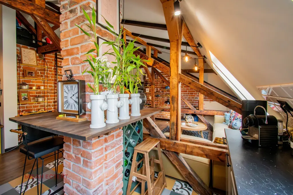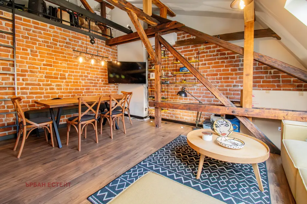 -Артистичен интериор естествени материали, открити греди, тухлени стени и индустриални акценти
