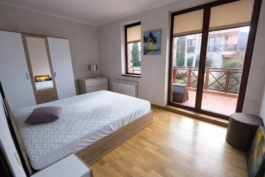 Имотът е обзаведен, с площ 109 кв.м, на 1-ви етаж от 3 етажна сграда. Разпределението включва просторна дневна с кухня и трапезария, две спални, две бани с тоалетна, мокро помещение и тераса.