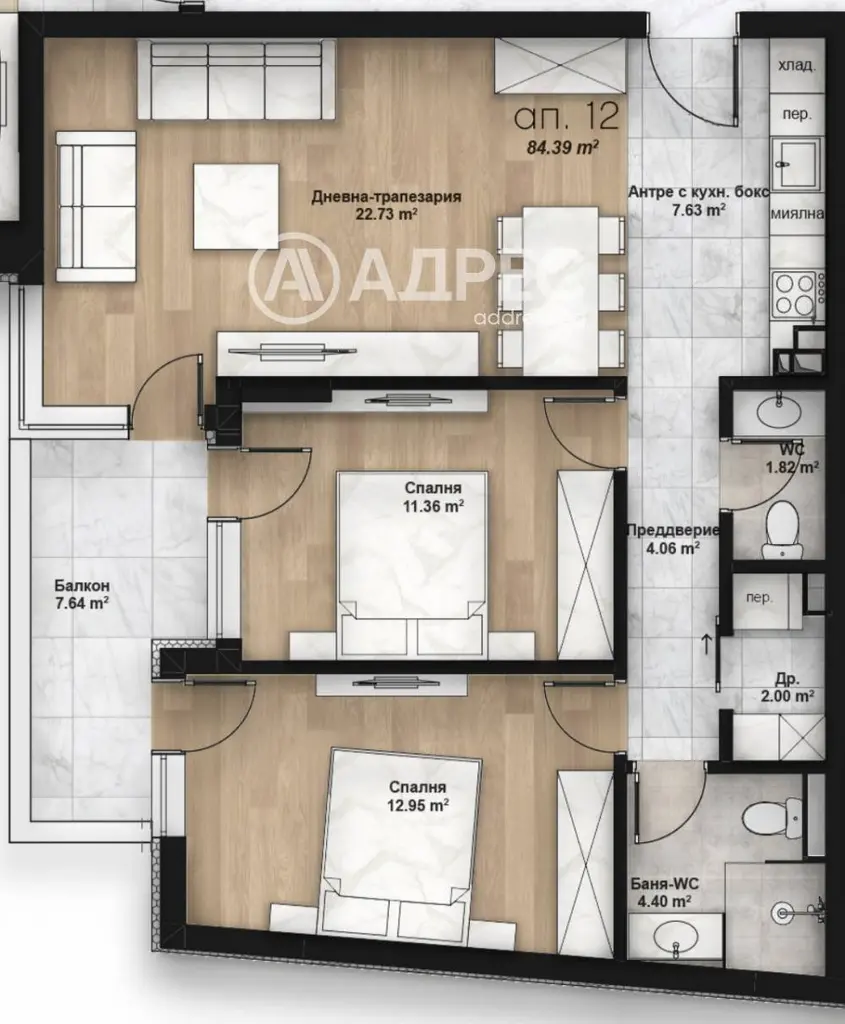 Тристаен апартамент в практично разпределение. Към имотът има възможност за закупуване на паркомясто - 20 000 евро. В цената е включено и мазе.