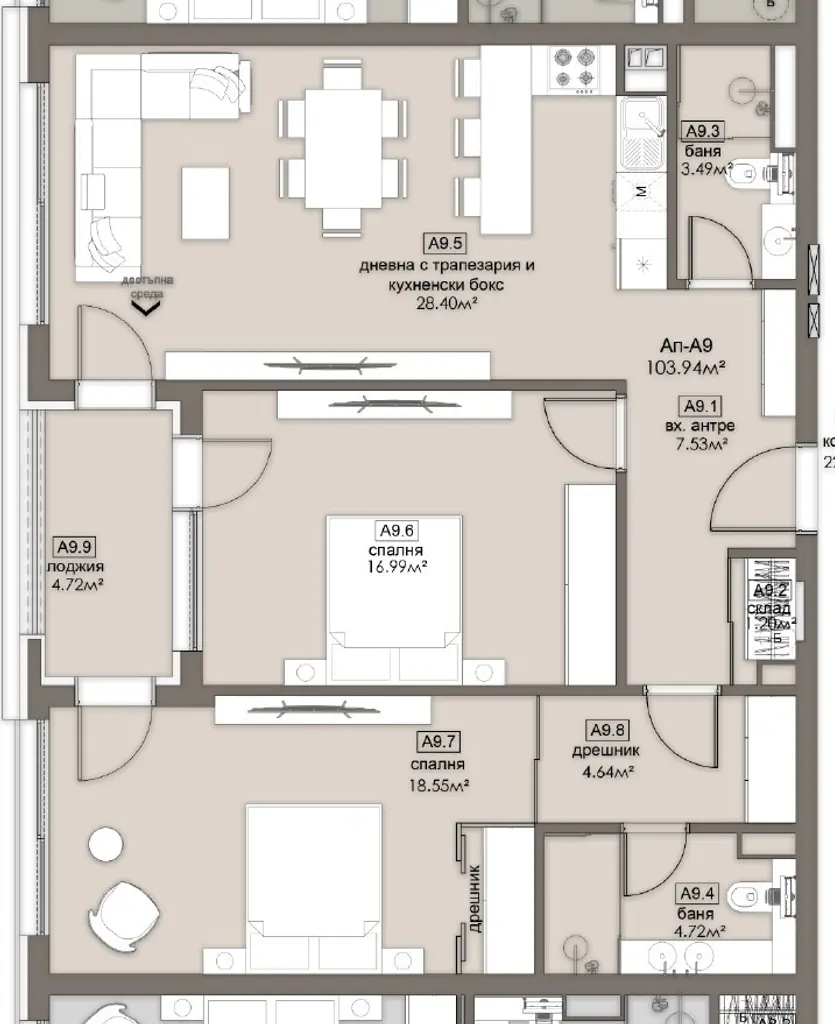 Просторен светъл и уютен тристаен апартамент, отговарящ на всички изисквания за един съвременен дом. Апартамент А9 на схемата. Удобно и функционално разпределение, големи, комфортни и светли помещения. Чиста площ 103,94кв.м., площ с общи части 119,06кв.м. Възможност за пълноценно и безкомпромисно обзавеждане на всички помещения.