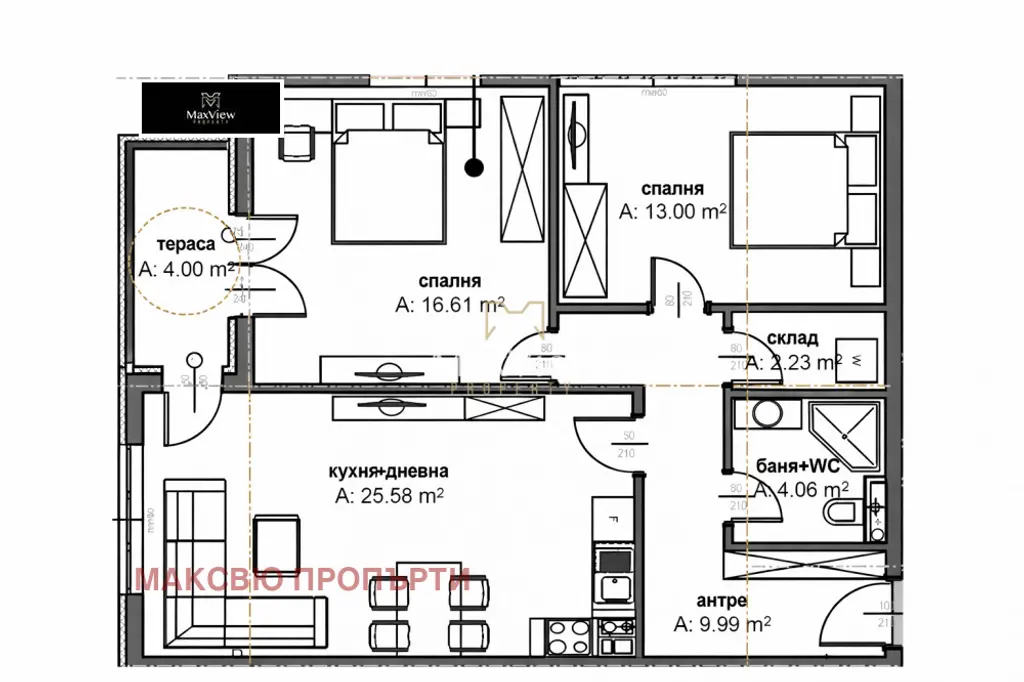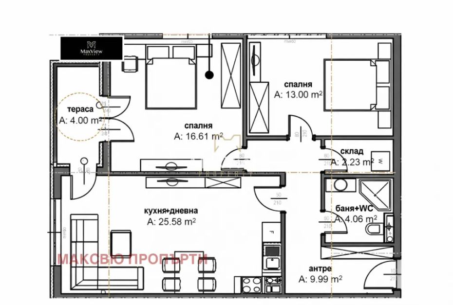 Жилището е с площ от 106 кв.м и разполага с функционално разпределение на стаите, подходящо за семейство.
