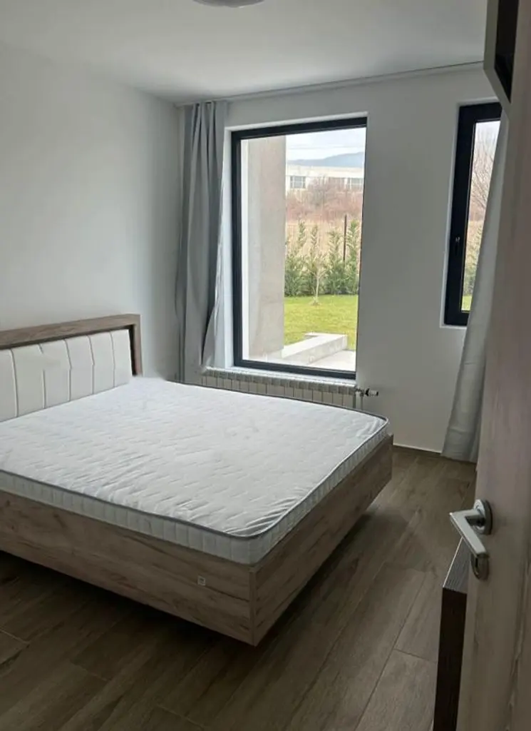 Разпределението включва две спални, просторен хол с кухненски бокс и две бани с тоалетни. Обзаведен, с газово отопление, апартаментът предлага комфорт и удобство. Месечният наем е 1300 EUR.