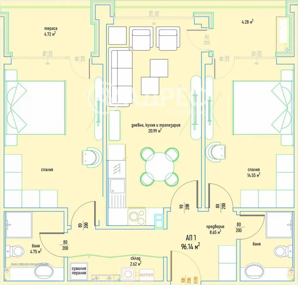 Тристаен апартаментразположен е на ПЪРВИ етаж. Върху площ от 96,14м2 са разположени: дневна с кухненски бокс и трапезария, две големи спални, две бани с тоалетни, мокро помещение и два балкона. Изложението е северг-изток. Има възможност за закупуване на паркомясто или гараж.