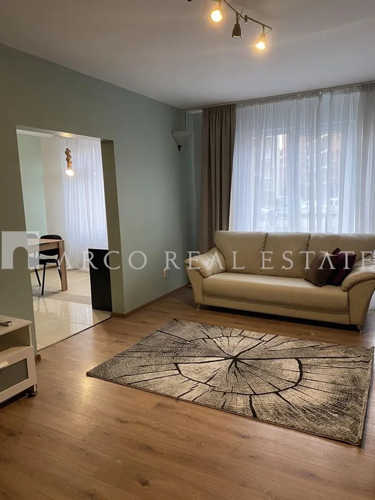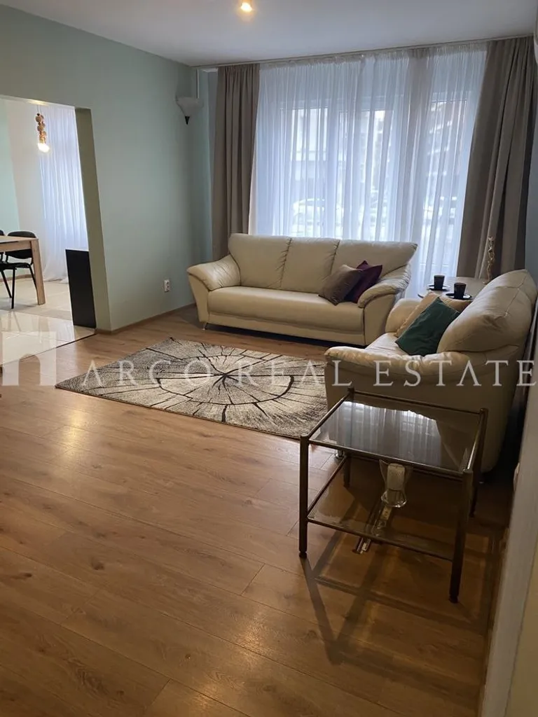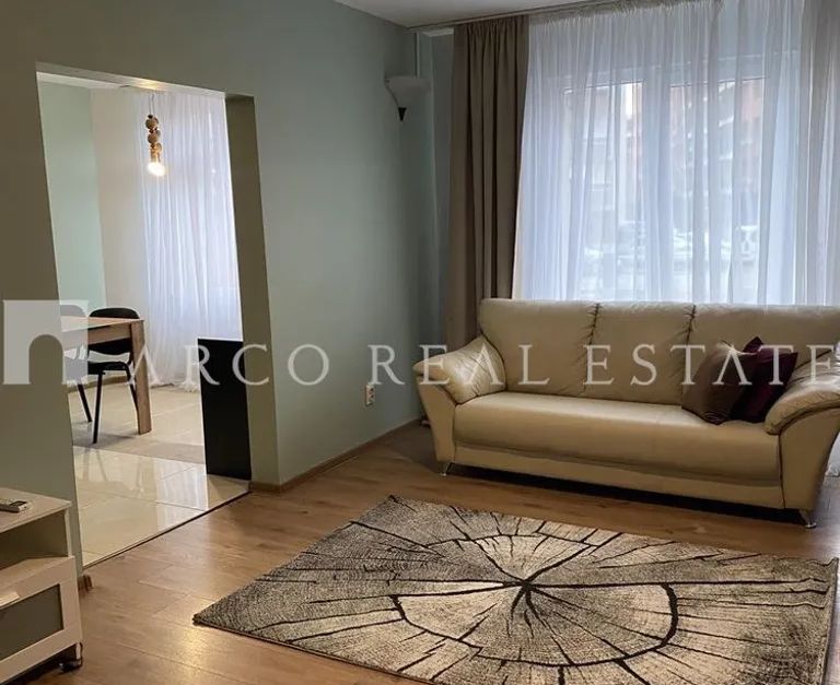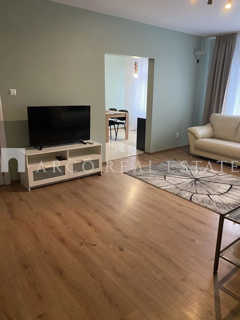 Апартаментът се състои от просторен хол с нови мебели, трапезарна част с маса и столове, кухненски шкафове, две спални ,едната с тераса и баня с тоалетна.