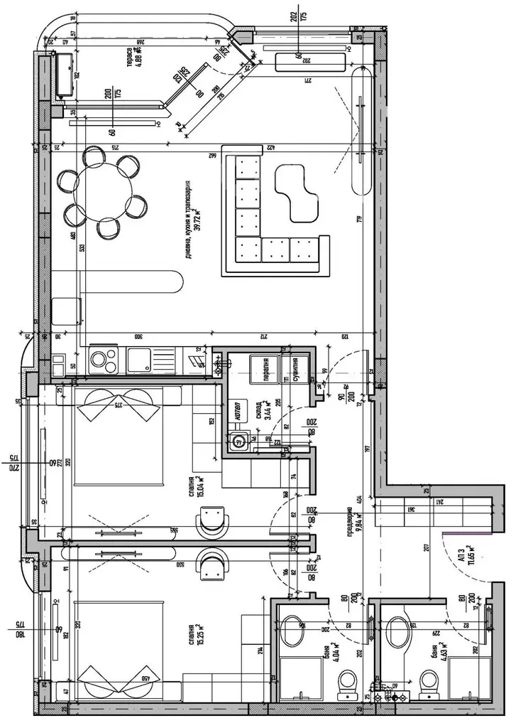 Разпределението включва дневна с кухненска част, две спални, две санитарни помещения и две тераси, което осигурява удобна функционалност за семейство.