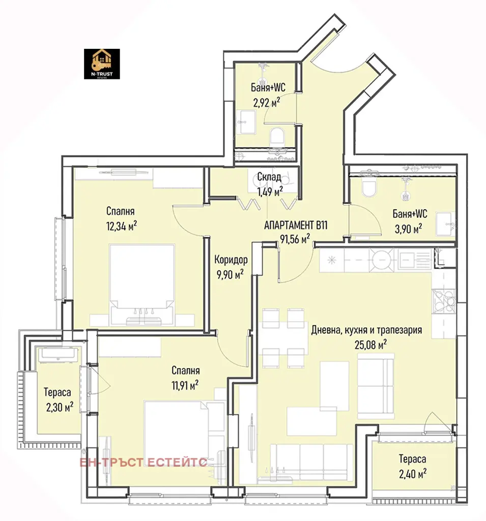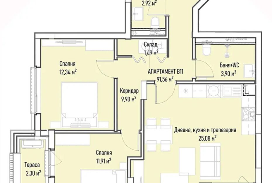 Апартамента е с чиста жилищна площ от 91.56 кв.м.