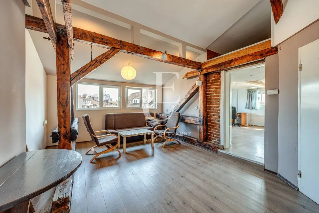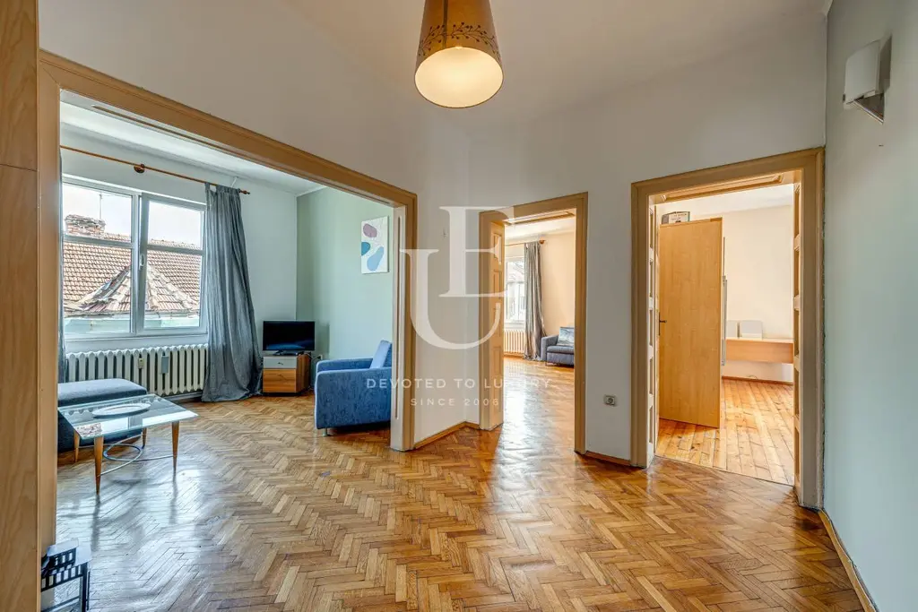 Апартамент с 4 стаи в град София, район Център, на тиха улица близо до бул. Витоша. Имотът заема последния четвърти етаж и таванския етаж над него в масивна тухлена сграда от 1930 г.