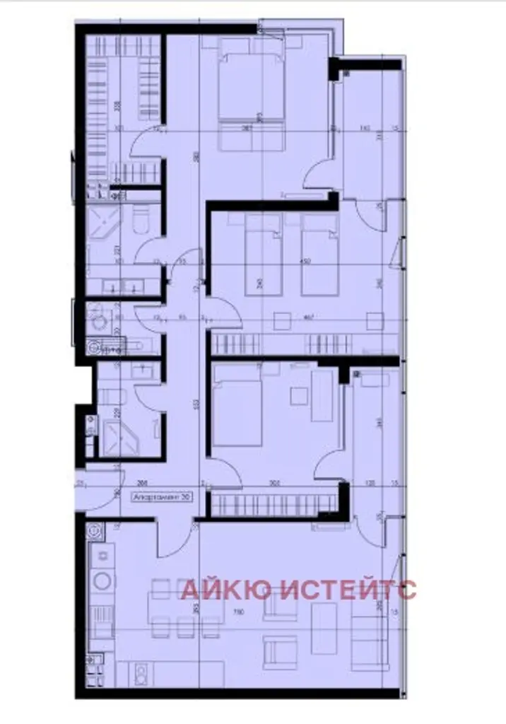 Апартамента е със следното разпределение: просторна дневна с трапезария и кухненски бокс- 29.03кв.м., 3 спални по 17.07, 11.19 и 16.07кв.м., 2 бани с тоалетни по 4кв.м. и 3.50кв.м, перално помещение-1.90кв.м., склад- 6.43кв.м, коридор и два балкона остъклени по 4.19 и 5.10кв.м. Чиста площ 122.96кв.м. Предава се на шпакловка и замазка! Отопление- газ. Излажение- изток. ЦЕНАТА Е БЕЗ ДДС. Нашите брокери работят без почивен ден.