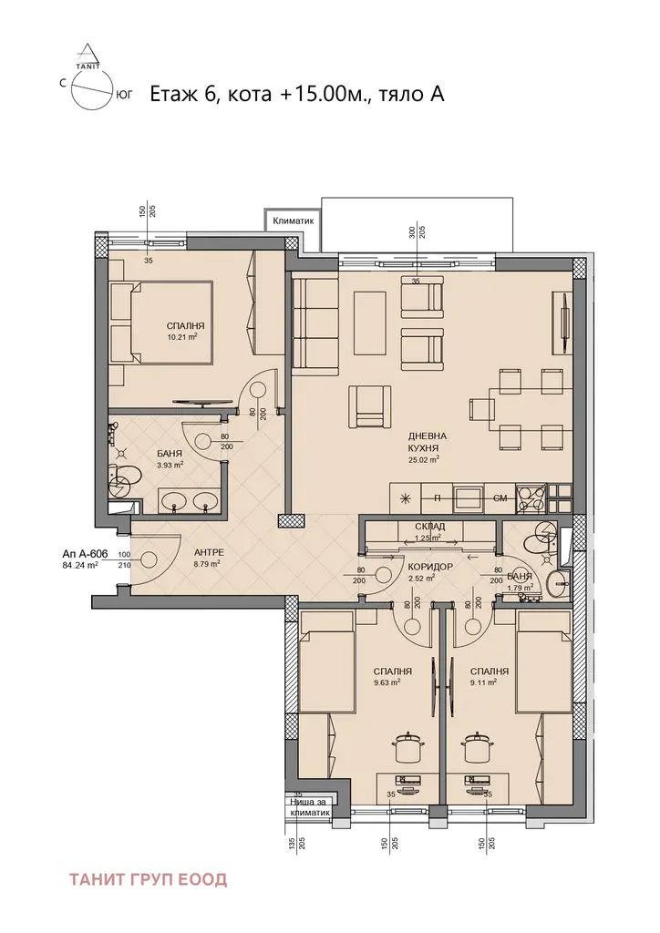 Предлагаме за продажба ап. А6 06, четиристаен, на шести жилищен етаж (кота +15,00м.) с РЗП 84 кв.м. (104кв.м. с вкл. общи части и 3 кв.м. склад) в новата ни сграда Lion Hill етап 1. Цената на апартамента е 216 000 евро с вкл. ДДС. В сградата все още има избор на едностайни, двустайни, тристайни, четиристайни апартаменти с различни големини и изложения, на различни етажи, както и паркоместа - разгледайте всички свободни обекти на уебсайта ни tanit.bg.