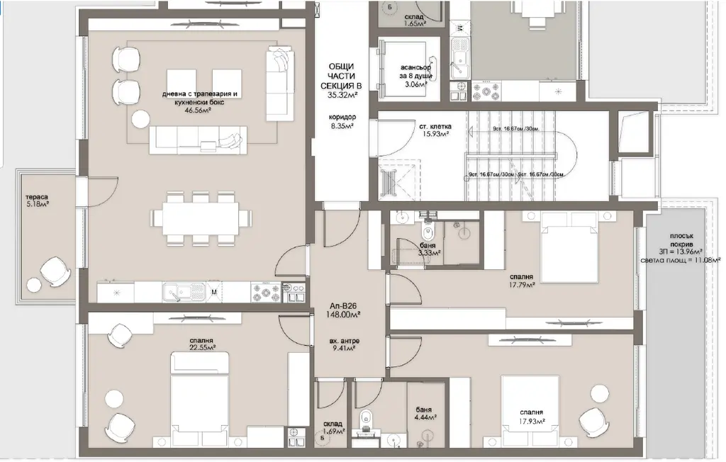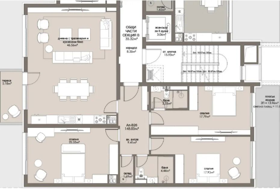 Просторен светъл и уютен четиристаен апартамент, отговарящ на всички изисквания за един съвременен дом. Апартамент В26 на схемата. Удобно и функционално разпределение, големи, комфортни и светли помещения. Чиста площ 148кв.м., площ с общи части 168,67кв.м. Възможност за пълноценно и безкомпромисно обзавеждане на всички помещения. Достъп до 36кв.м. покривна тераса.