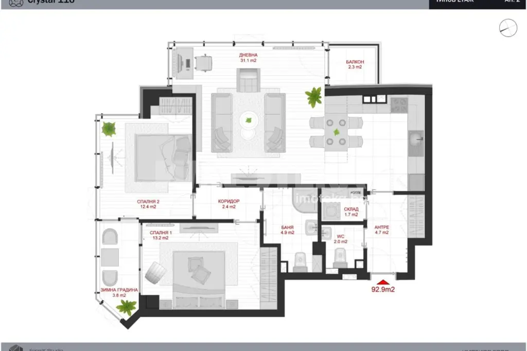 Разпределение включва входно антре, тоалетна за гости, мокро помещение, просторен хол с кухненски бокс и малка открита тераса, две спални, баня с тоалетна и закрита тераса - зимна градина.