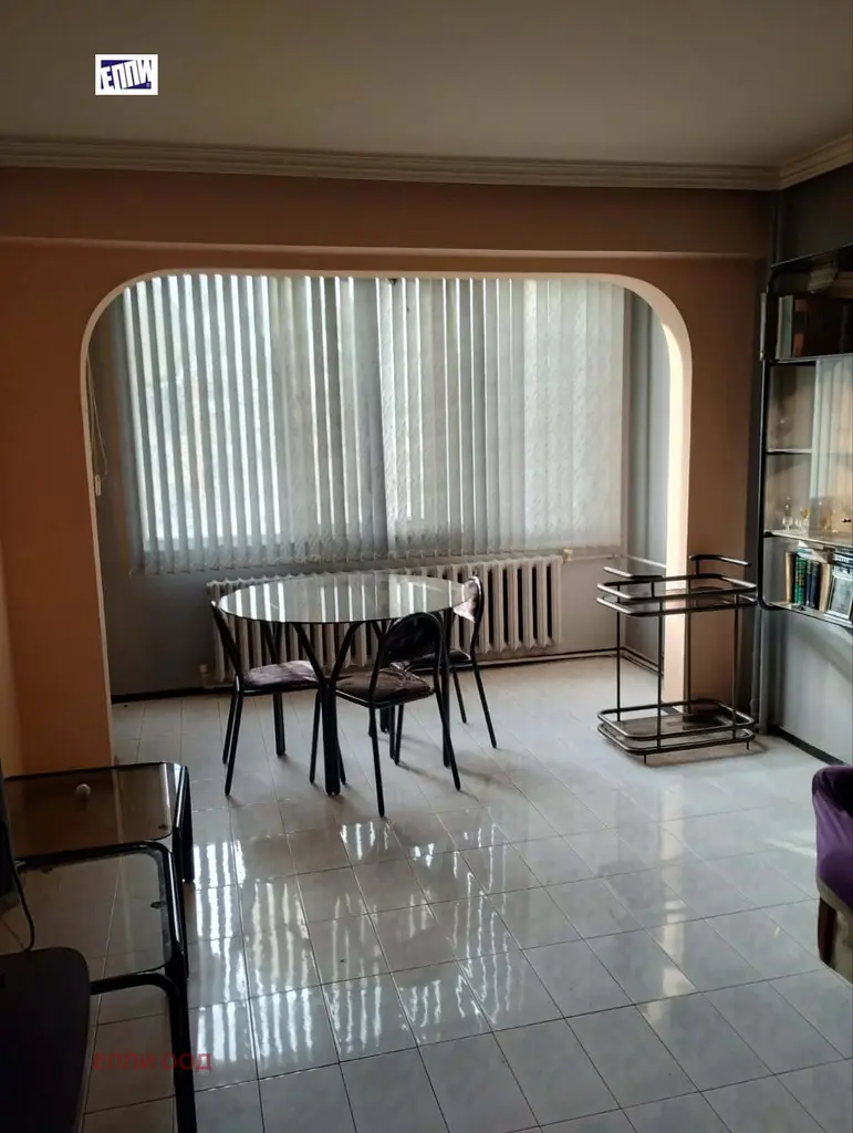 Вътрешен, непреходен двустаен апартамент, 60 кв. м по документи, състоящ се от входно антре, дневна, кухня, спалня, баня с тоалетна и два балкона (лоджии), един от които усвоен; централен ТЕЦ, с мазе, двустранно изложение: юи - сз, контролиран достъп в сградата, свободно паркиране;