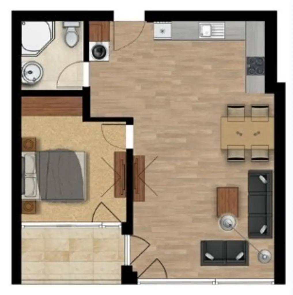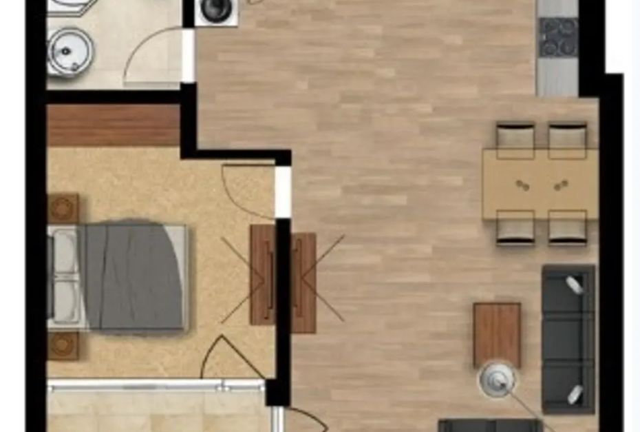 Разпределението включва дневна с кухненски бокс, спалня, баня с тоалетна и тераса с изложение юг/изток. Възможност за закупуване на подземен гараж.