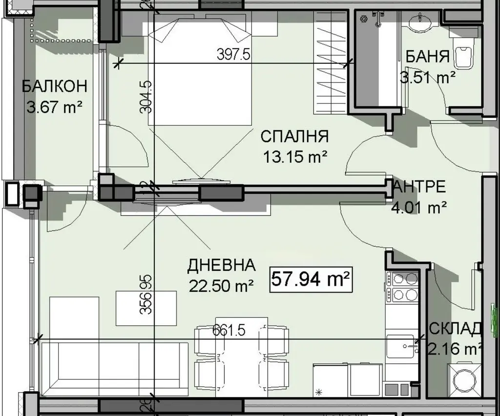 Апартамент с площ 67 кв.м, разположен на 2-ри етаж в нова тухлена сграда от 2027 г. в квартал Манастирски ливади, София.